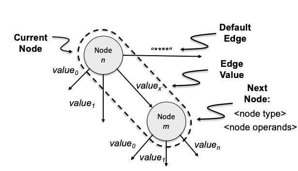 Graph execution starts with an initial node specific to each graph (Graph ID) which is fetched from the GM. Each node has an ID, Node Type and Node Operands which specifies operations to be performed on the input vector or internal stored context. The operation produces an edge value. Example operations might be as simple as selecting some bits from the input vector to produce a new edge value, or the operation might be compared to some selected bit with a range of values or as complex as linear algebra calculation as part of a Support Vector Machine (SVM). If an edge value is not found, then the default edge is used.